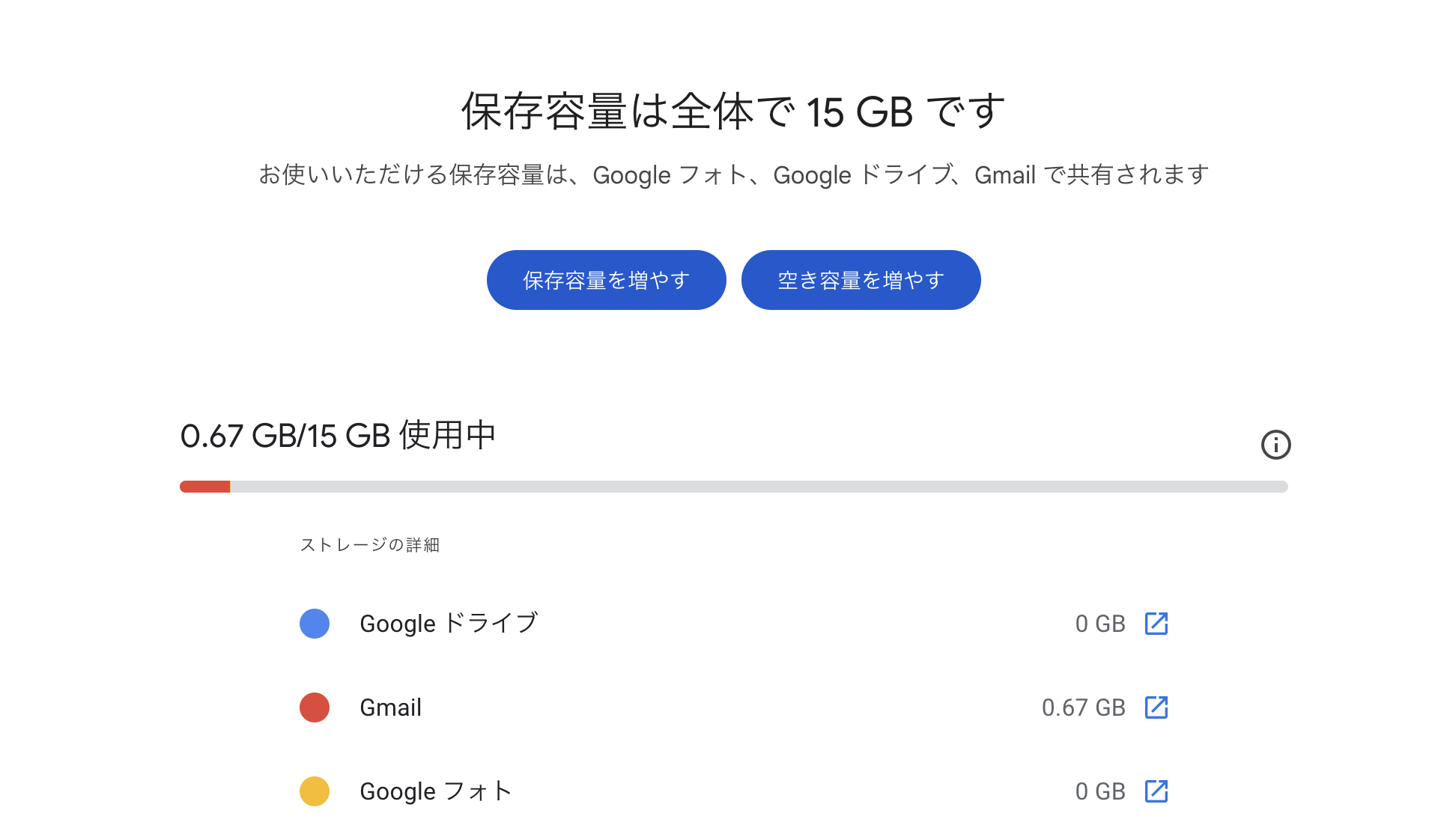 Gmailの容量は、簡単に確認できます。Gmailのストレージは、GoogleドライブやGoogleフォトと共通の15GBが無料で使用できます。Google ストレージ管理ページ