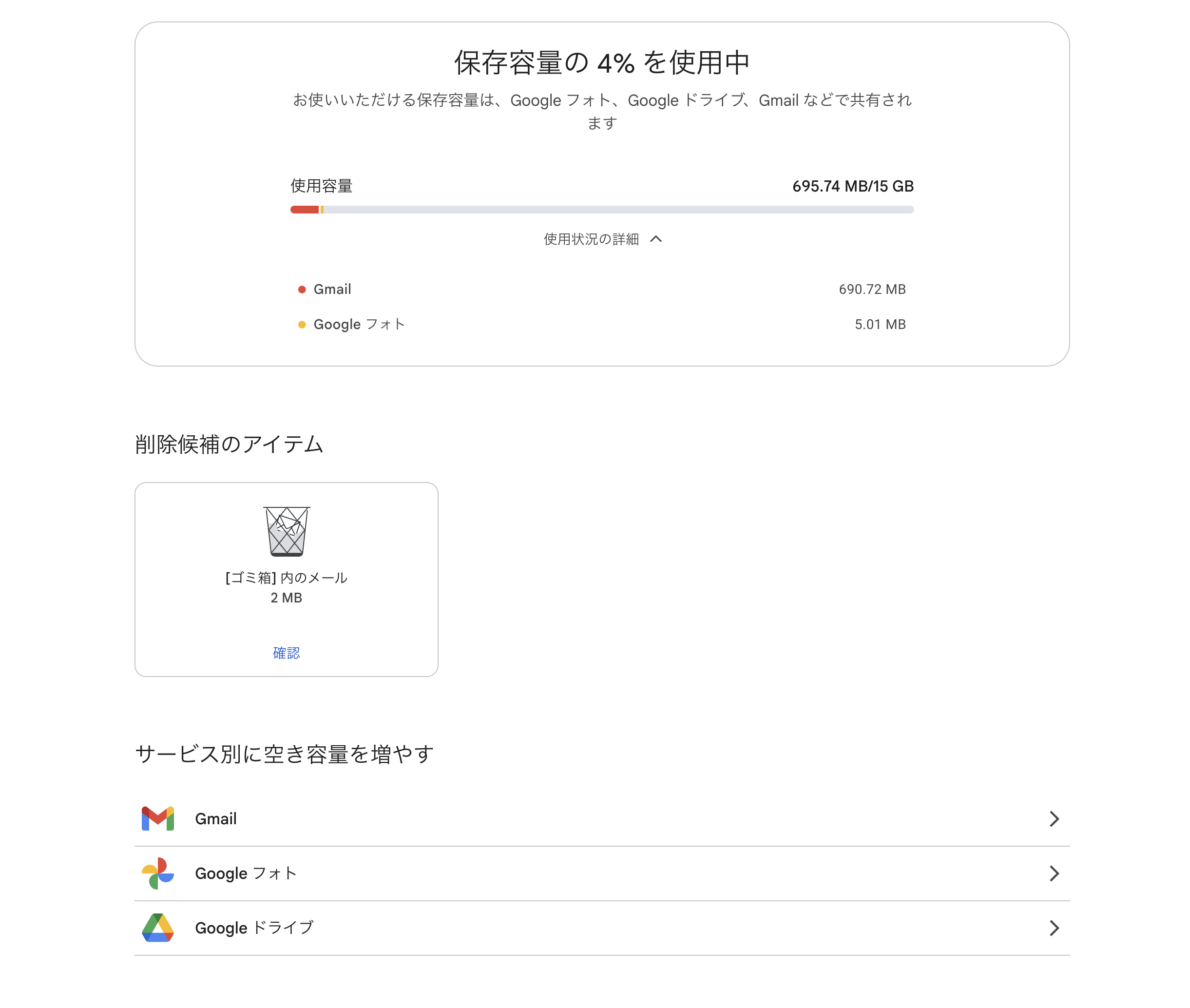 「Gmail」「Googleドライブ」「Googleフォト」の使用量をチェックできます